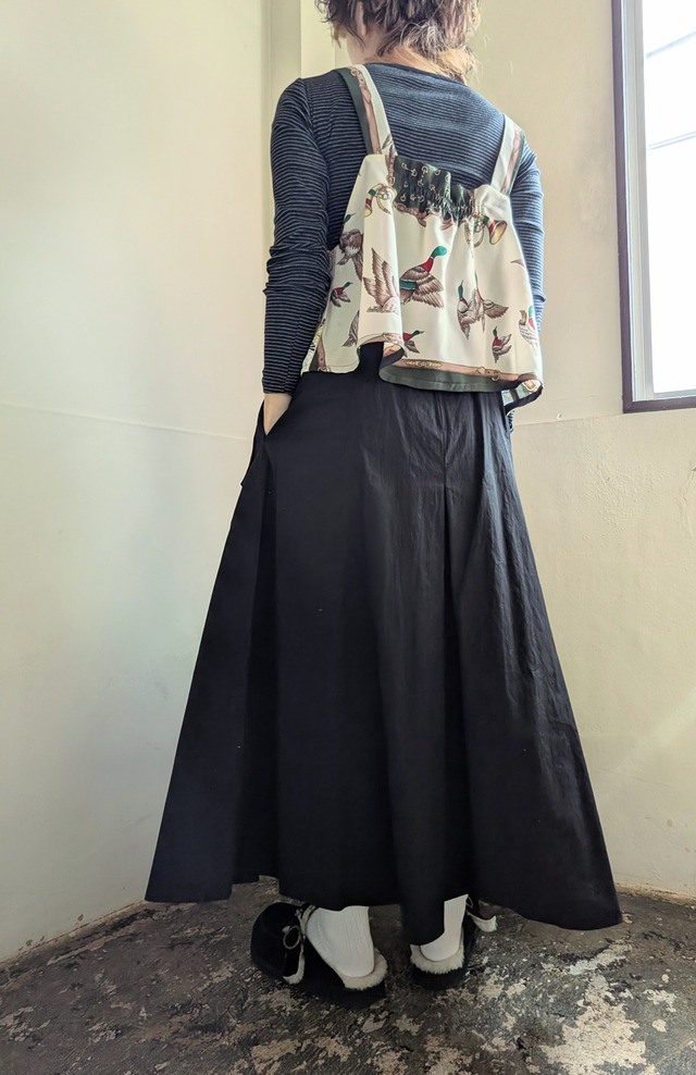 REHERSALL リハーズオール ume別注アイテム アソートになります。 古着のスカーフファブリック を使用したオーバーキャミソール。 被りで着るデザインです。 冬はスウェットやニット 春夏はTシャツやブラウスと 重ねてシーズンレスに使えるアイテムです。 シンプルなコーディネートに華やかさをプラス 出来ます。後ろ部分にはゴムが入っており、 着脱がしやすくなっています。 スカーフ生地ならではの 落ち感、滑らかさがとても綺麗な一着です。 ※この商品には古着素材を使用しています。 古着特有の風合いやデザインにアレンジを加え、 さらに品質を高めることで新たな魅力を 引き出されています。 1点ごとに個体差があること、 もともとのダメージをそのまま活かしていること、 一部にリペアが施されていることを ご理解ください。 画像の掲載部分以外にもダメージや汚れがある 箇所がある場合もございます。お買物の際は 古着のリメイクアイテムとして ご理解、ご了承くださいませ。 古着慣れされておられる方におすすめの商品です。 返品などは致しかねますので、 ご理解いただける方にお買い上げいただけたらと 思います。どうぞよろしくお願いいたします。 品番 AT-289 色 アソート 素材 ポリエステル 95% その他 5% 日本製 手洗い可能 平置き採寸 身幅 約65cm 総丈 約50cm サイズ ワンサイズ 商品画像について 出来るだけ実物に近い状態で 撮影は行っておりますが 撮影状況により実物と画像の色味が 多少異なる場合があります。 通信販売について お買い物をしていただく前に 特定商取引法を必ずご確認下さい。