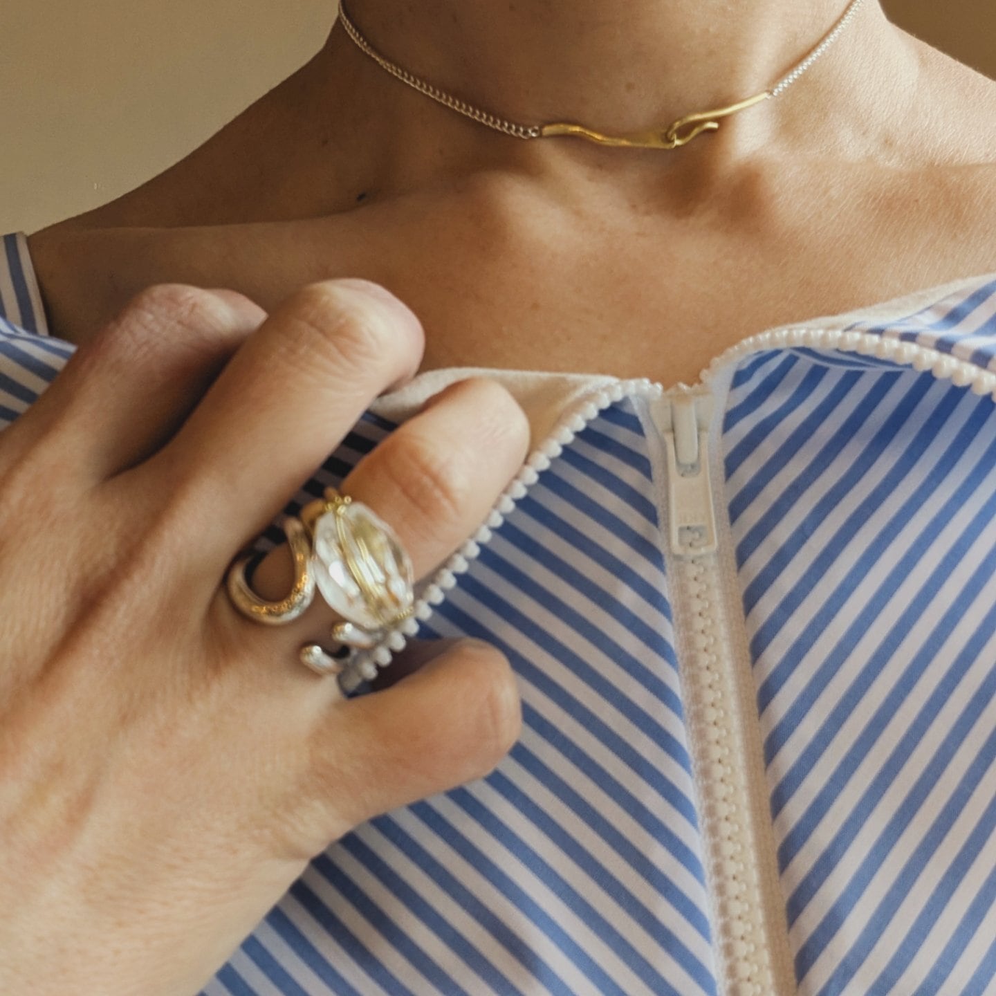 アクセサリーブランドmaitriマイトリーより 真鍮の台座に水晶のついた 新作のクォーツリングになります。 10号12号14号サイズのお作りとなります。 軽く付けやすいです。 重ね付けもおすすめです。 品番 RG-100 素材 真鍮 石 水晶 ブランドの付属の箱をお付けして お届けいたします。 〈 お取り扱いについて 〉 水分・汗・ほこりなどは金属の変色や くすみの原因となります。 外された際は柔らかい布や専用のクロスで 汗や汚れを優しく拭いて しばらくお使いになられない時などは 空気にあまり触れないように、 袋などに入れて保管してください。 体質によってかゆみやかぶれを 生じる場合がございます 皮膚に異常を感じた時はご使用を お止めいただき専門医にご相談ください。 〈 シルバーと真鍮のお手入れについて 〉 外気に触れ続けたり、汗や水分などの付着も 変色・劣化の原因となります。 温泉などは黒くなってしまいますので 必ず外してください。 保管する際は密閉できる袋にしまっておくことを お奨めします。 汚れや黒ずみは、研磨剤が入った布で磨くと 輝きが取り戻せます。 ※マット仕上げの物は磨くとコーティングは 取れて、艶が出ます。 使用されている中でもコーティングは 自然と取れていきますので、 経年変化を楽しんで頂くのもシルバーの 良さかと思います。 1点、1点手作業で作られる作品の為 同じ品番でも微妙なデザインの違い サイズ感の違いがございます。 サイズ表記は出来るだけ細かくさせて いただいておりますが、返品・交換が できませんので ご試着いただけない上で大変恐縮ですが ご理解いただきました上お買い物をして いただけたらと思います。 日本製 商品画像について 出来るだけ実物に近い状態で 撮影は行っておりますが 撮影状況により実物と画像の 色味が多少異なる場合があります。 通信販売について お買い物をしていただく前に 特定商取引法を必ずご確認下さい。
