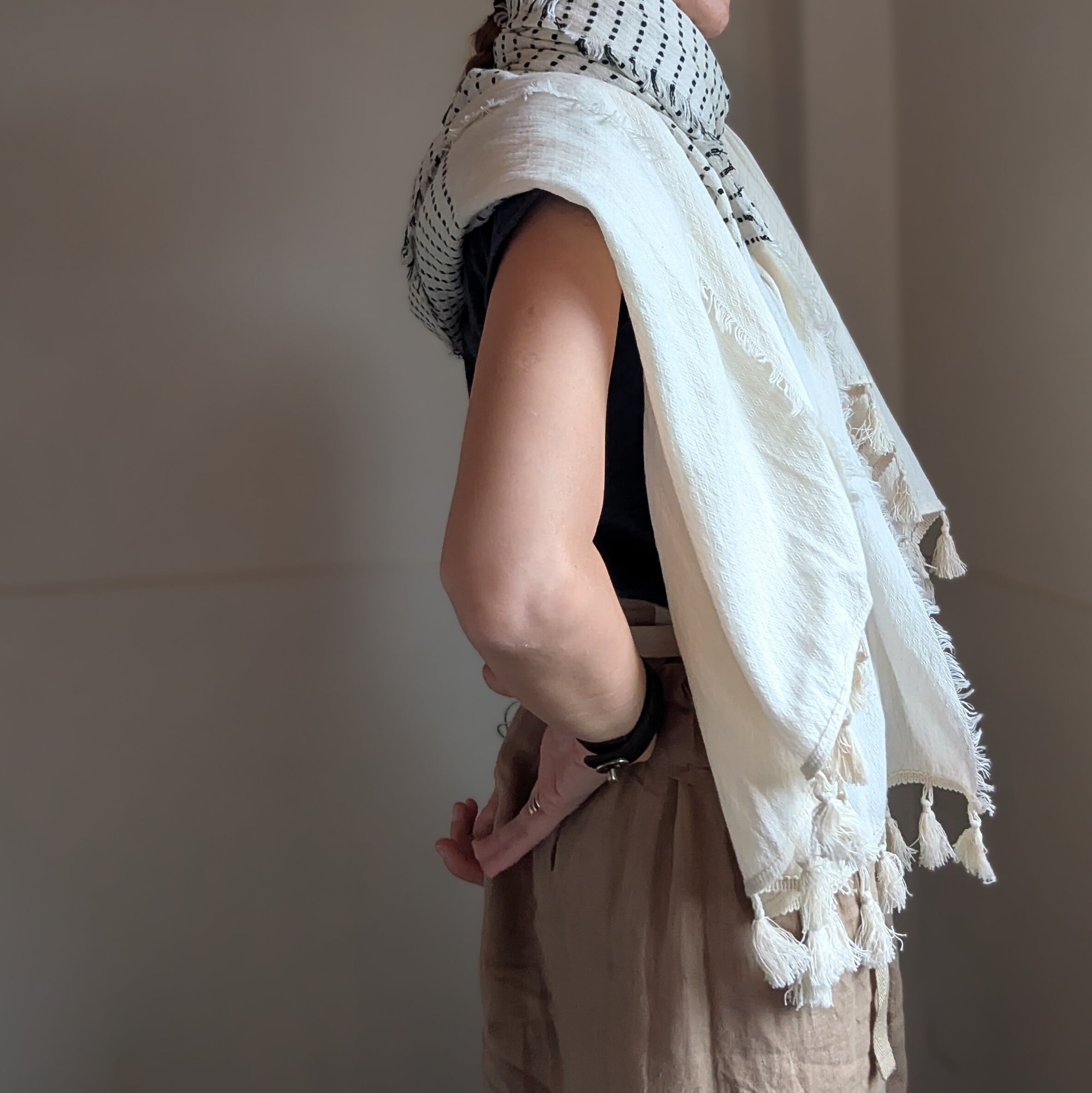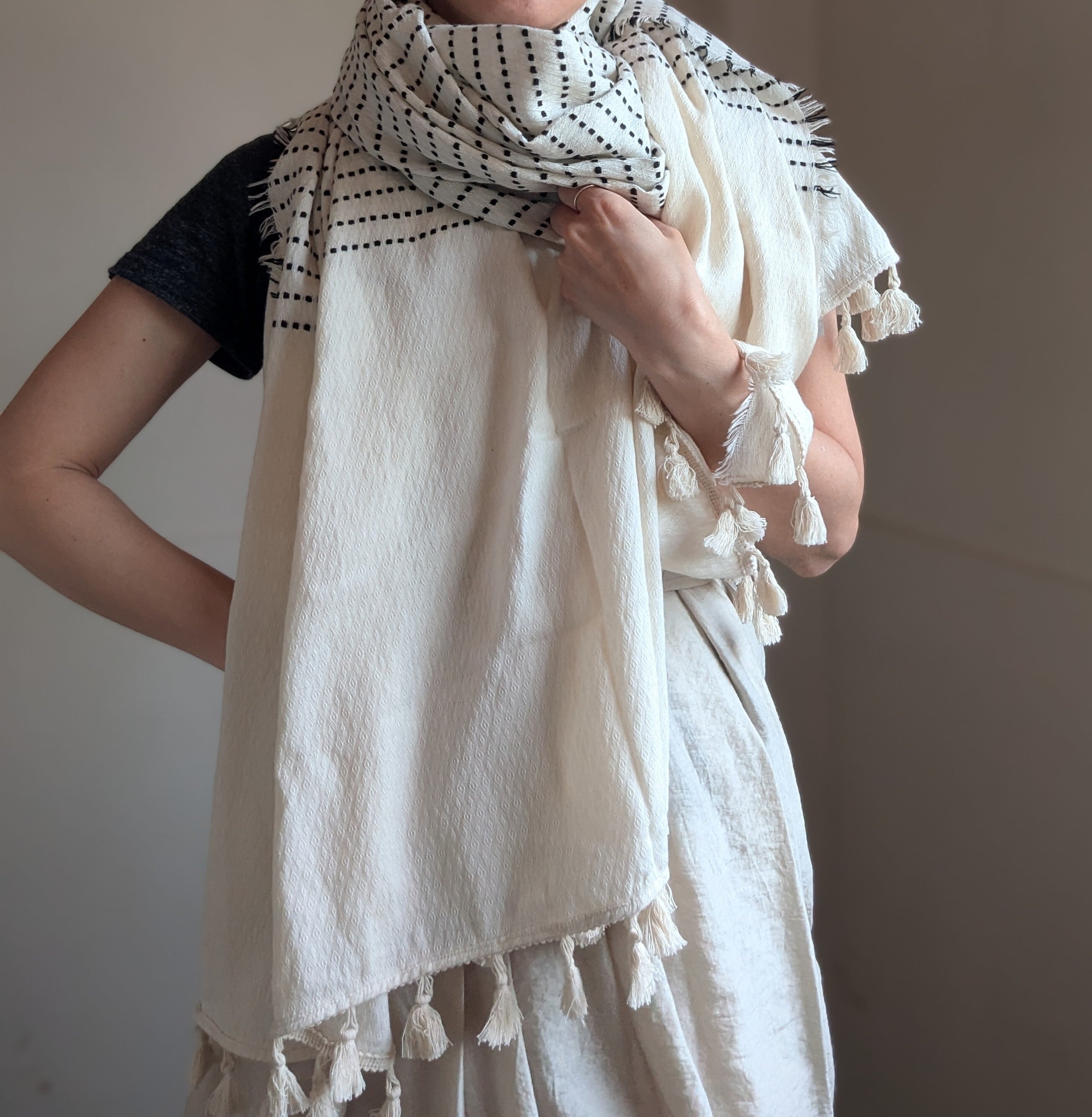 細かな幾何学柄が入ったオフホワイトのジャガード生地にドットの様なシンプルなステッチの大判ショール。