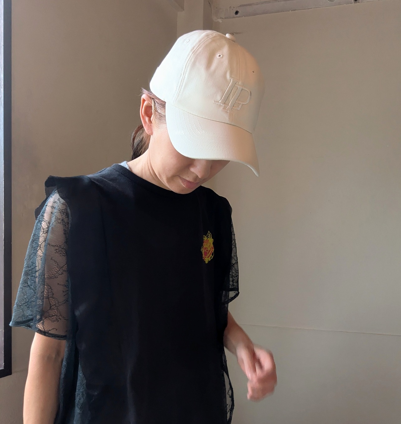 少し浅めの黒、チャコールっぽい色味の花柄レースと