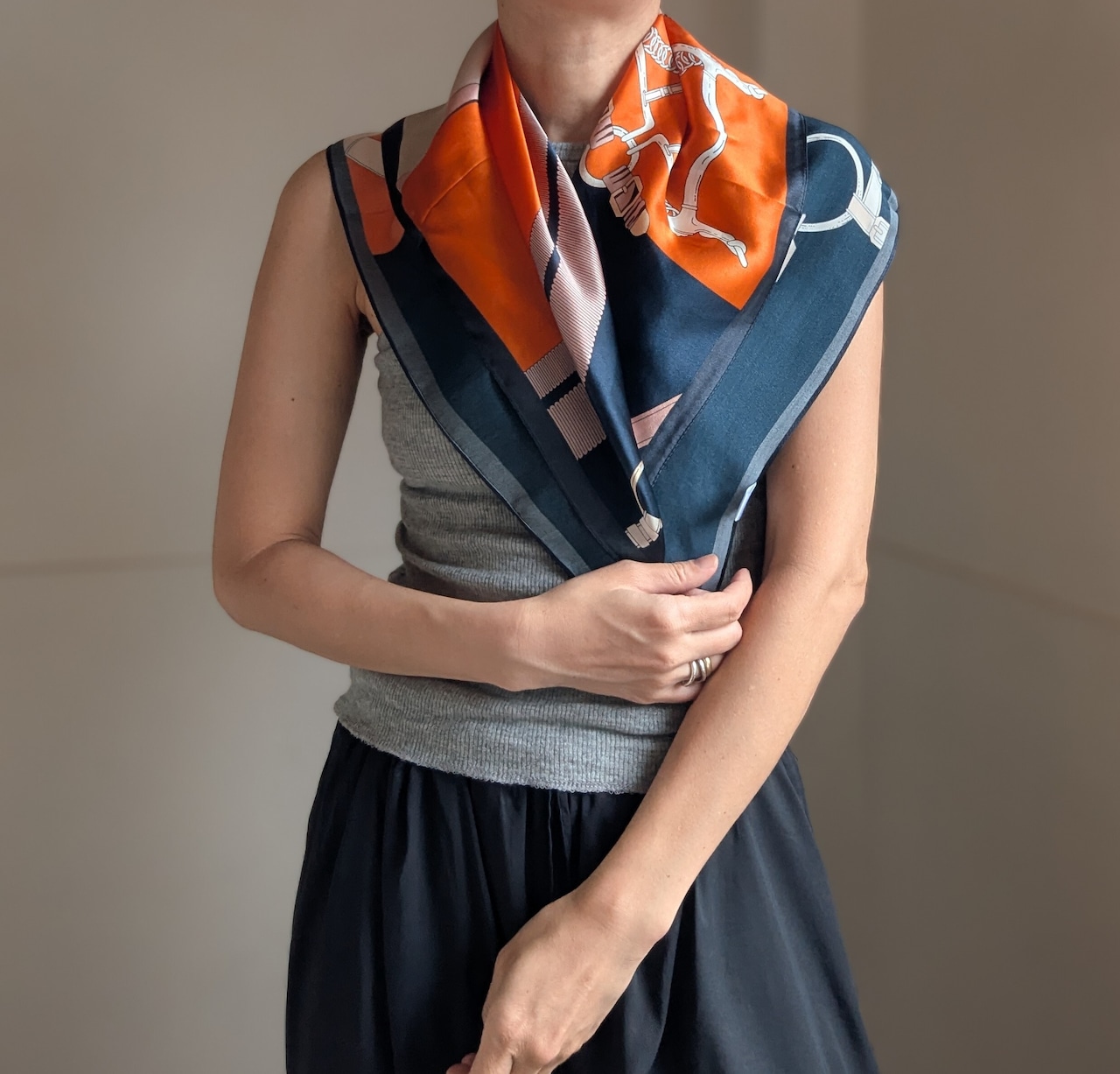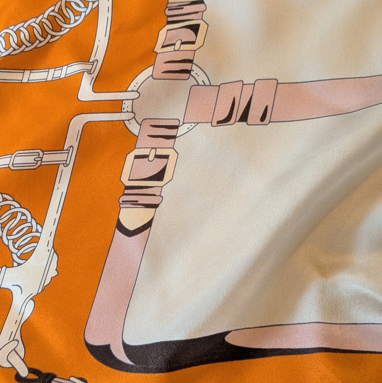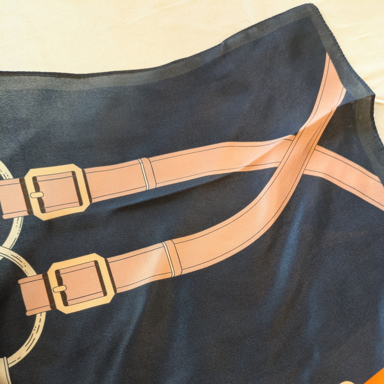 シルクスカーフ / ネイビー×オレンジの馬具柄 / 65×65cm