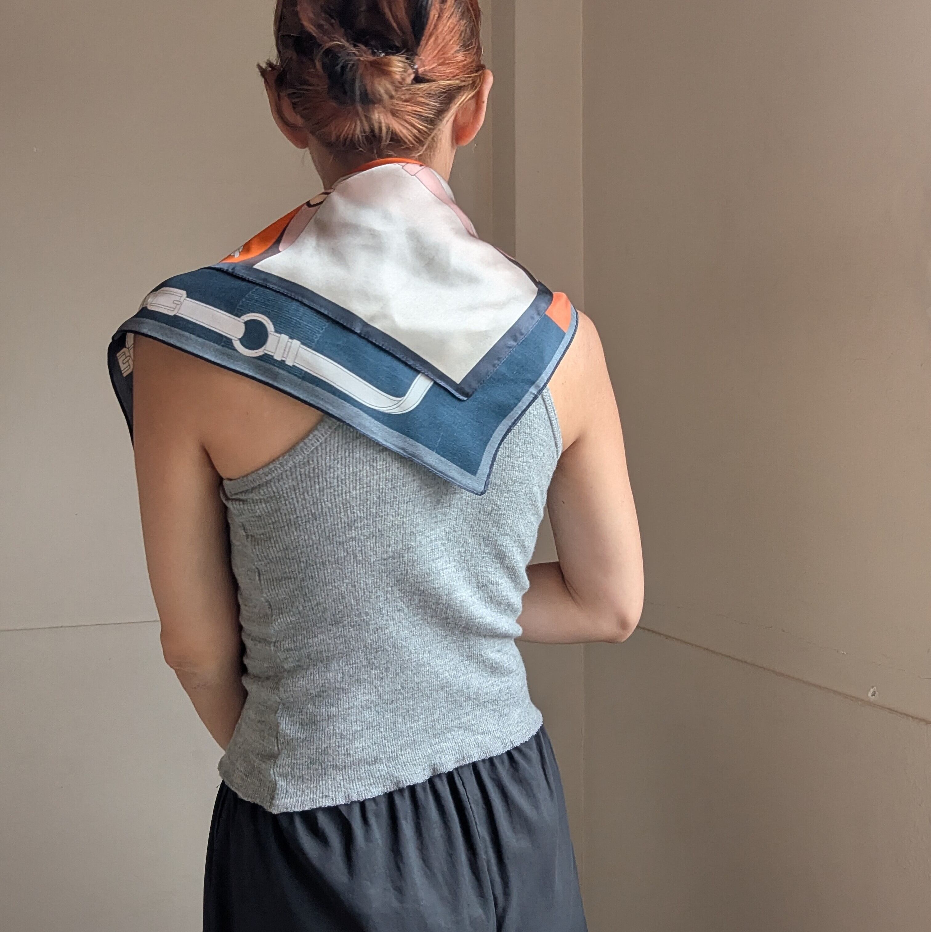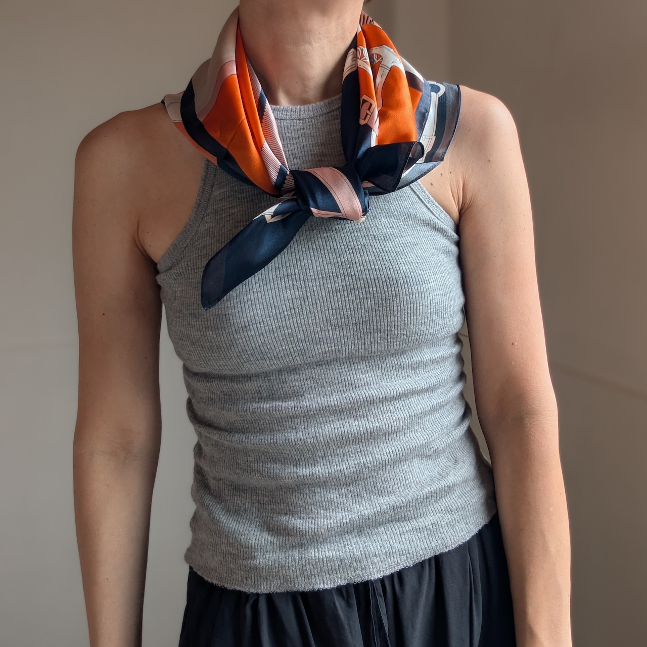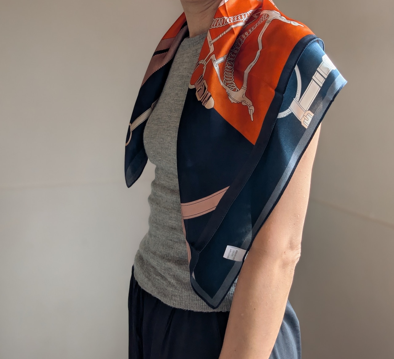 シルクスカーフ / ネイビー×オレンジの馬具柄 / 65×65cm