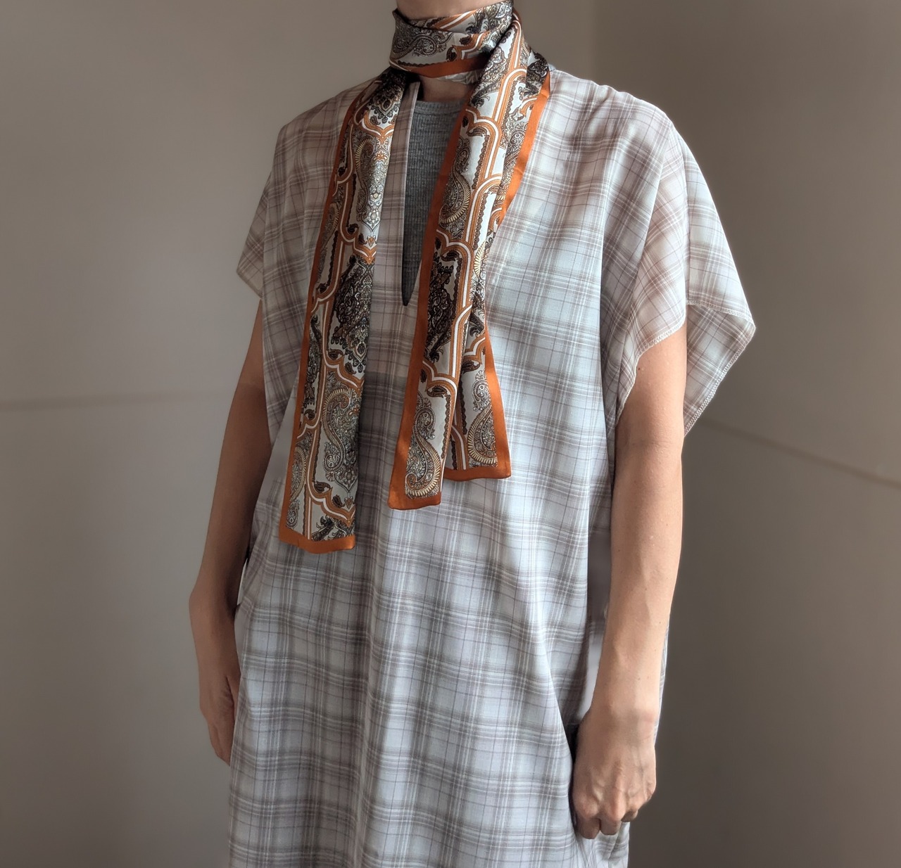 シルクリボンスカーフ / ゴールド×グレー柄 / 147cm×17cm