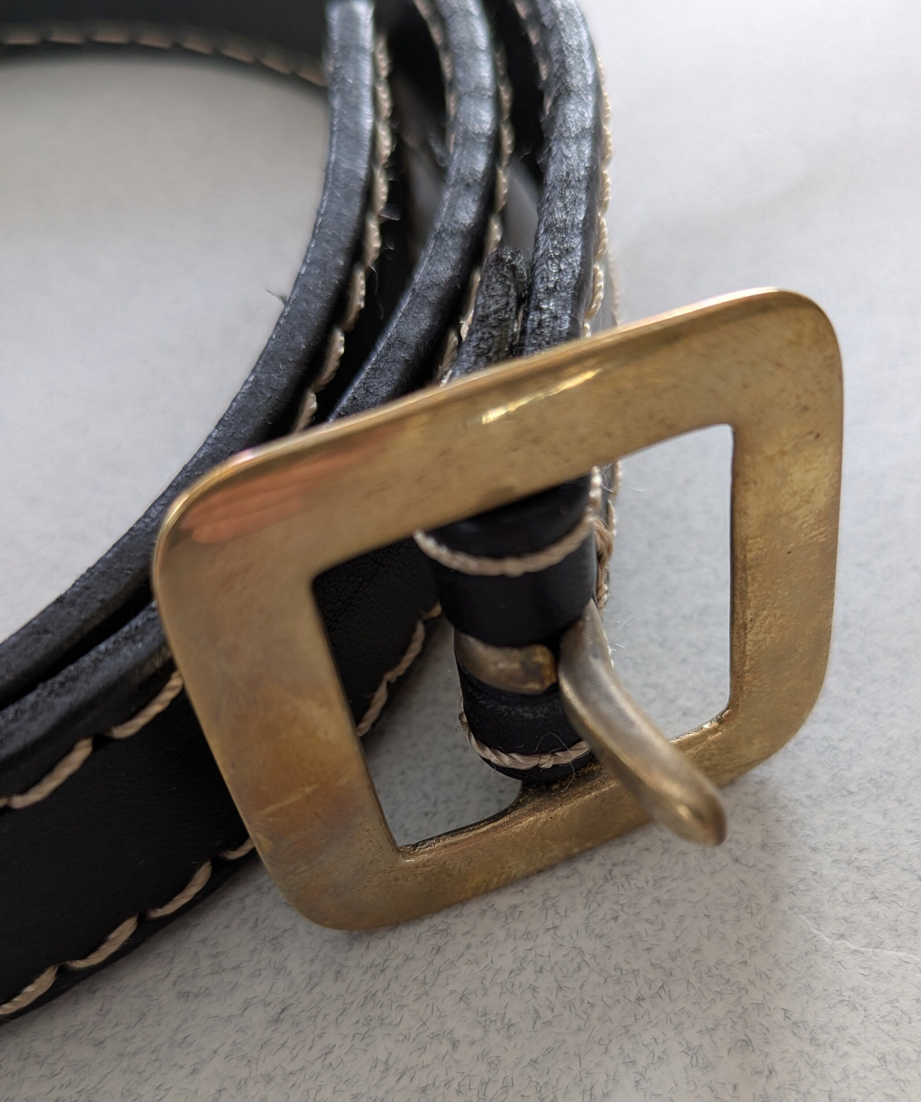 真鍮素材の個性的なスクエア型のバックルが