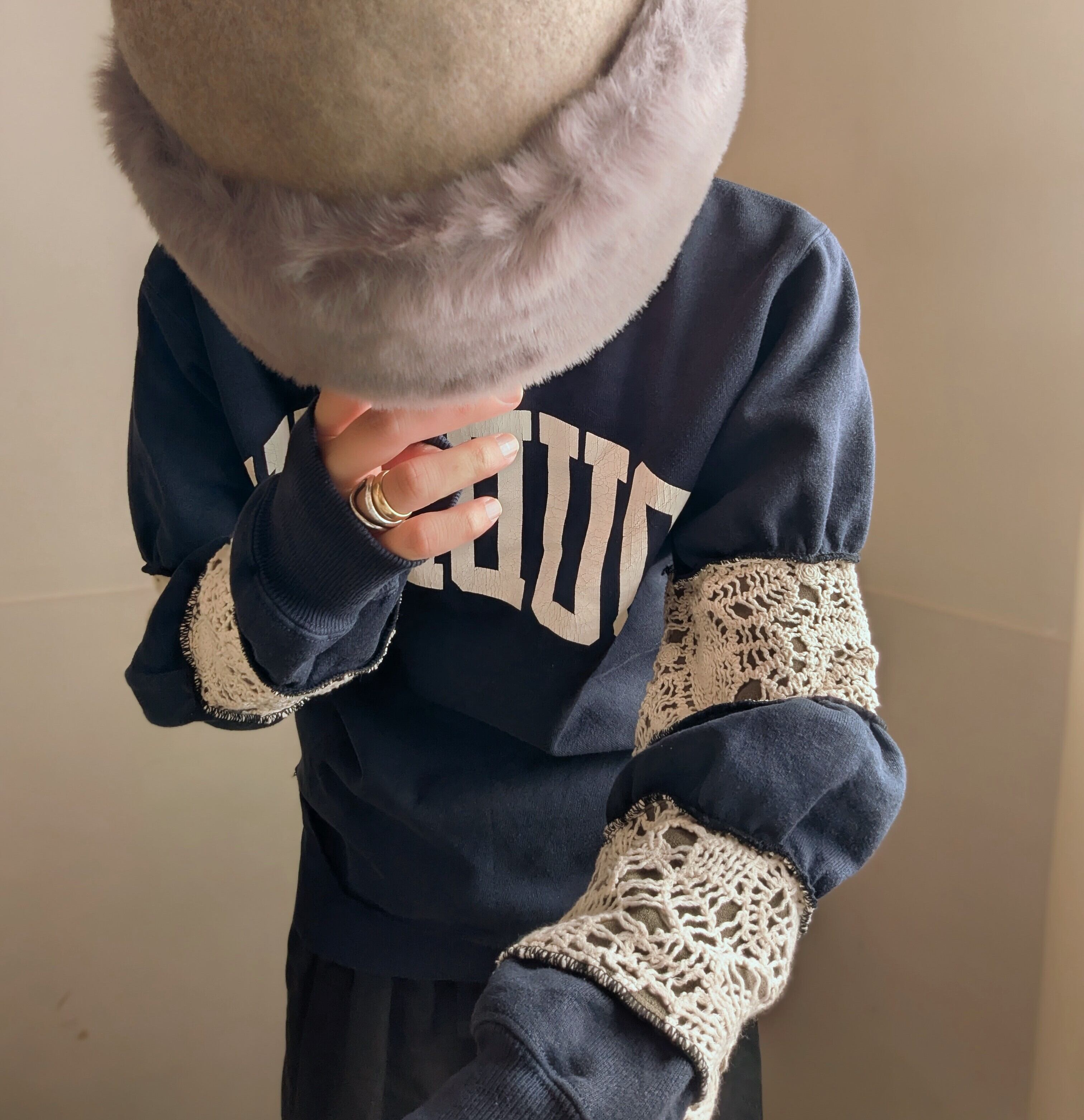 袖をリブやレースで絞った