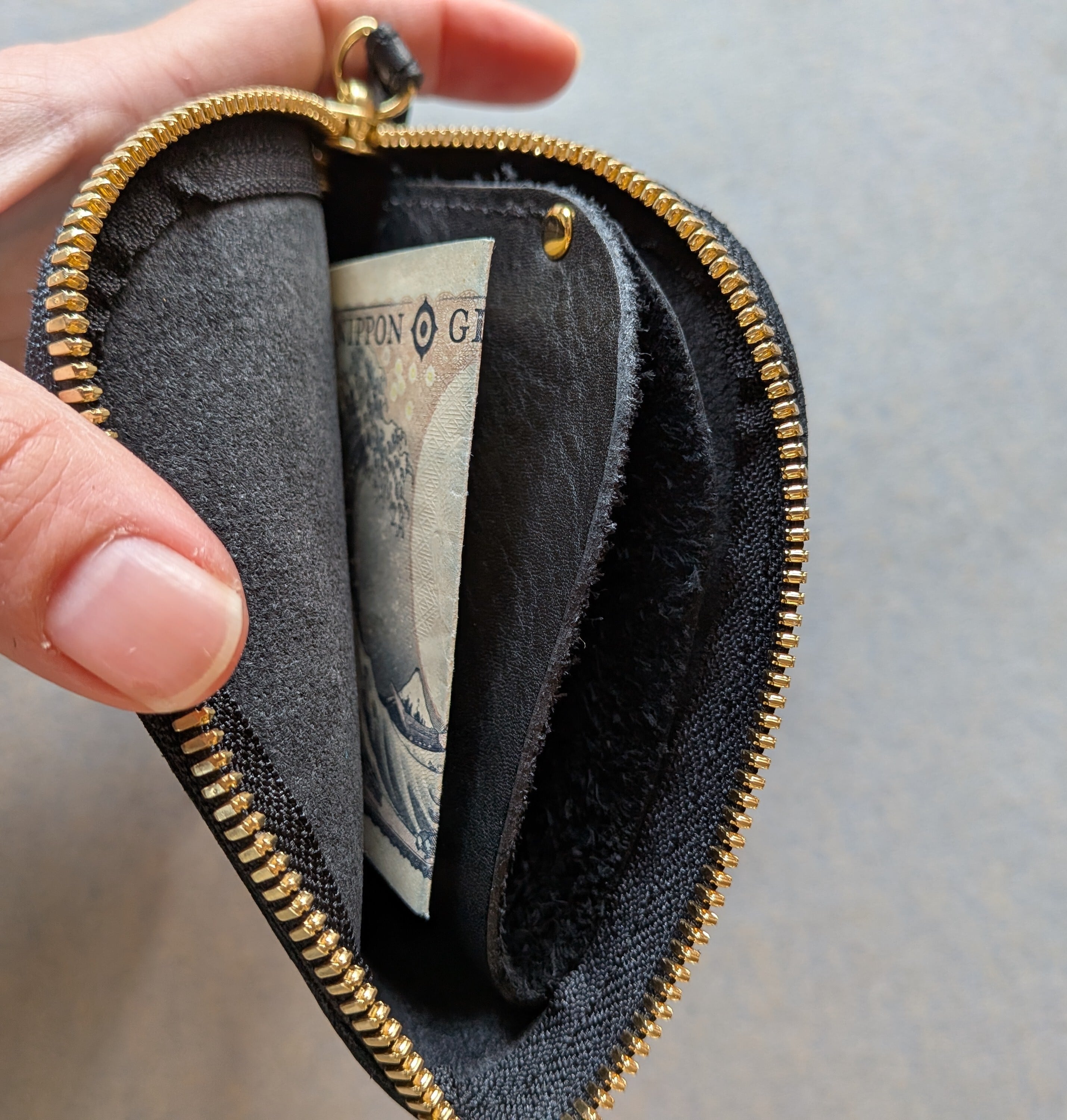 小銭を入れてその両サイドに二つ折りでお札を