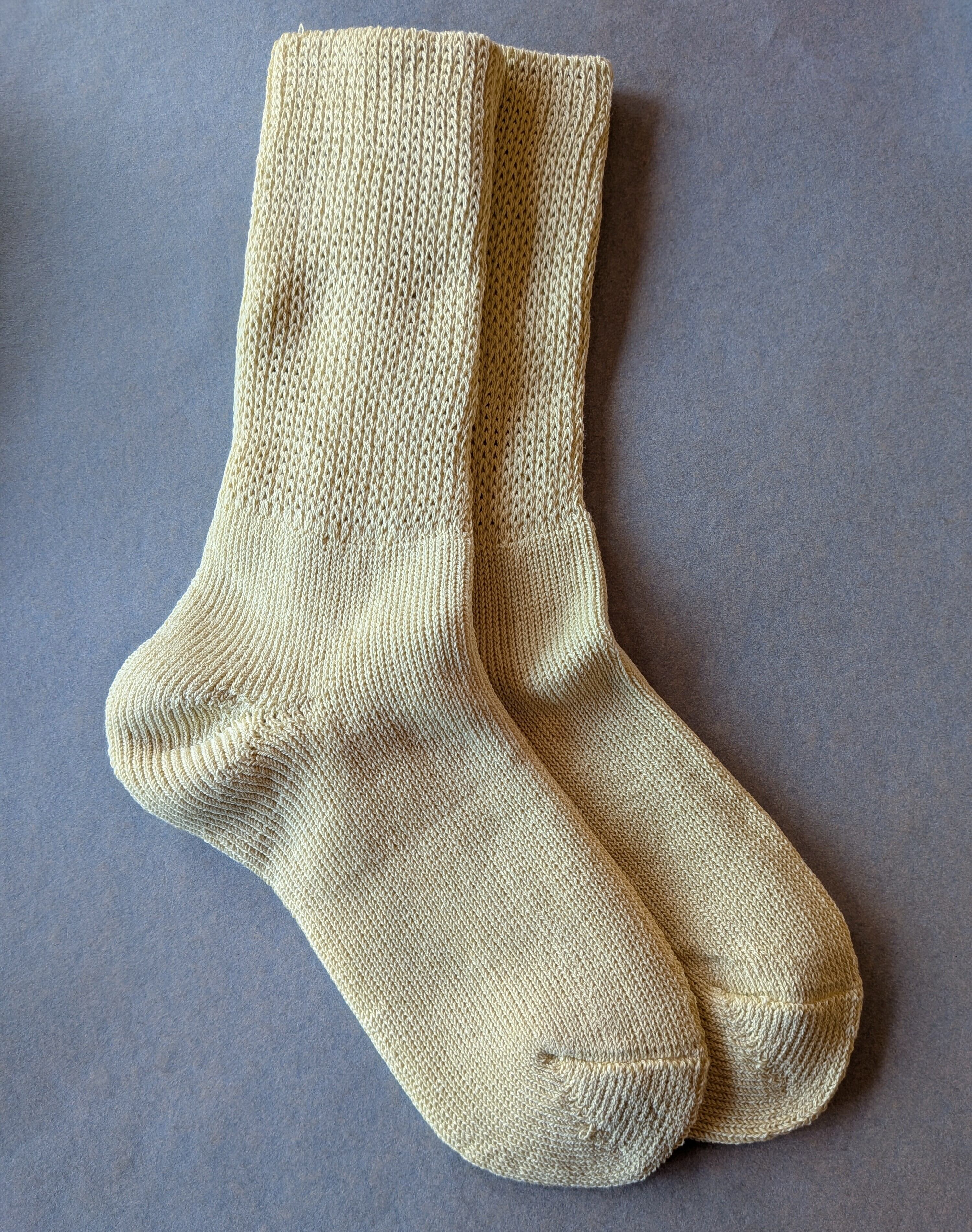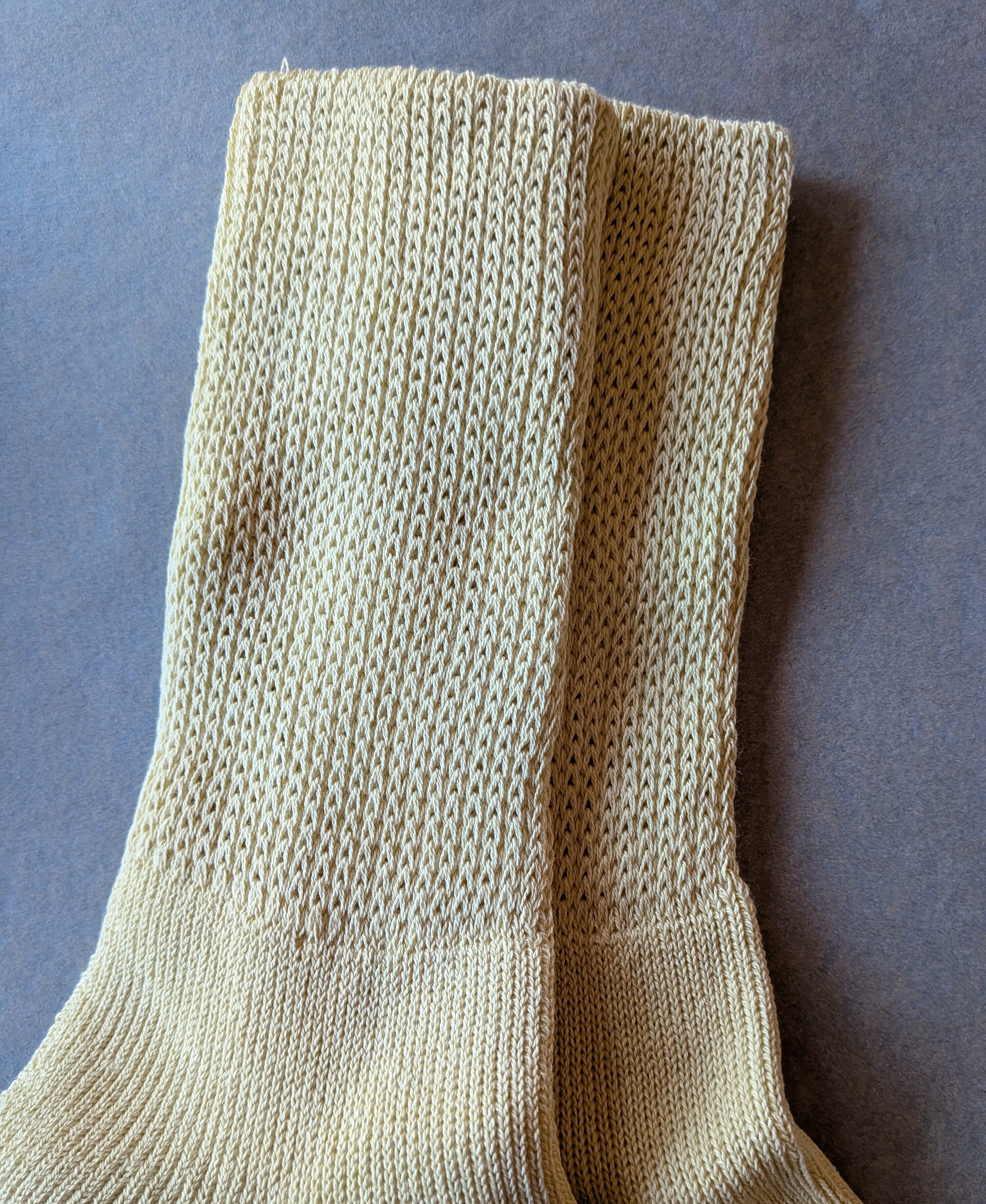 ガーゼのように柔らかく目の粗い特殊な編み地により締め付けを抑え、長時間履いていても痕が残らず、ずれ落ちない特徴を持っています。