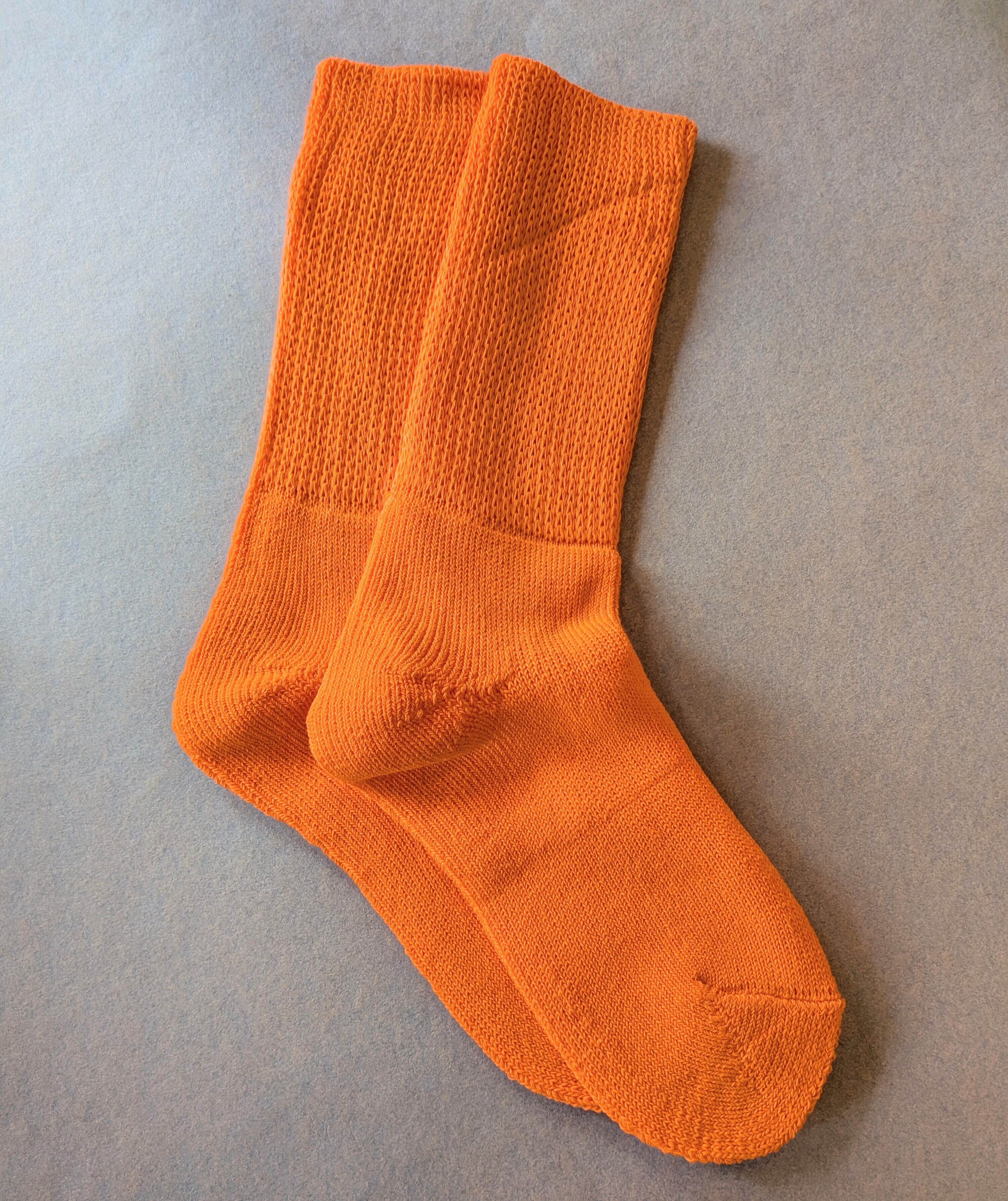 ガーゼのように柔らかく目の粗い特殊な編み地により締め付けを抑え、長時間履いていても痕が残らず、ずれ落ちない特徴を持っています。