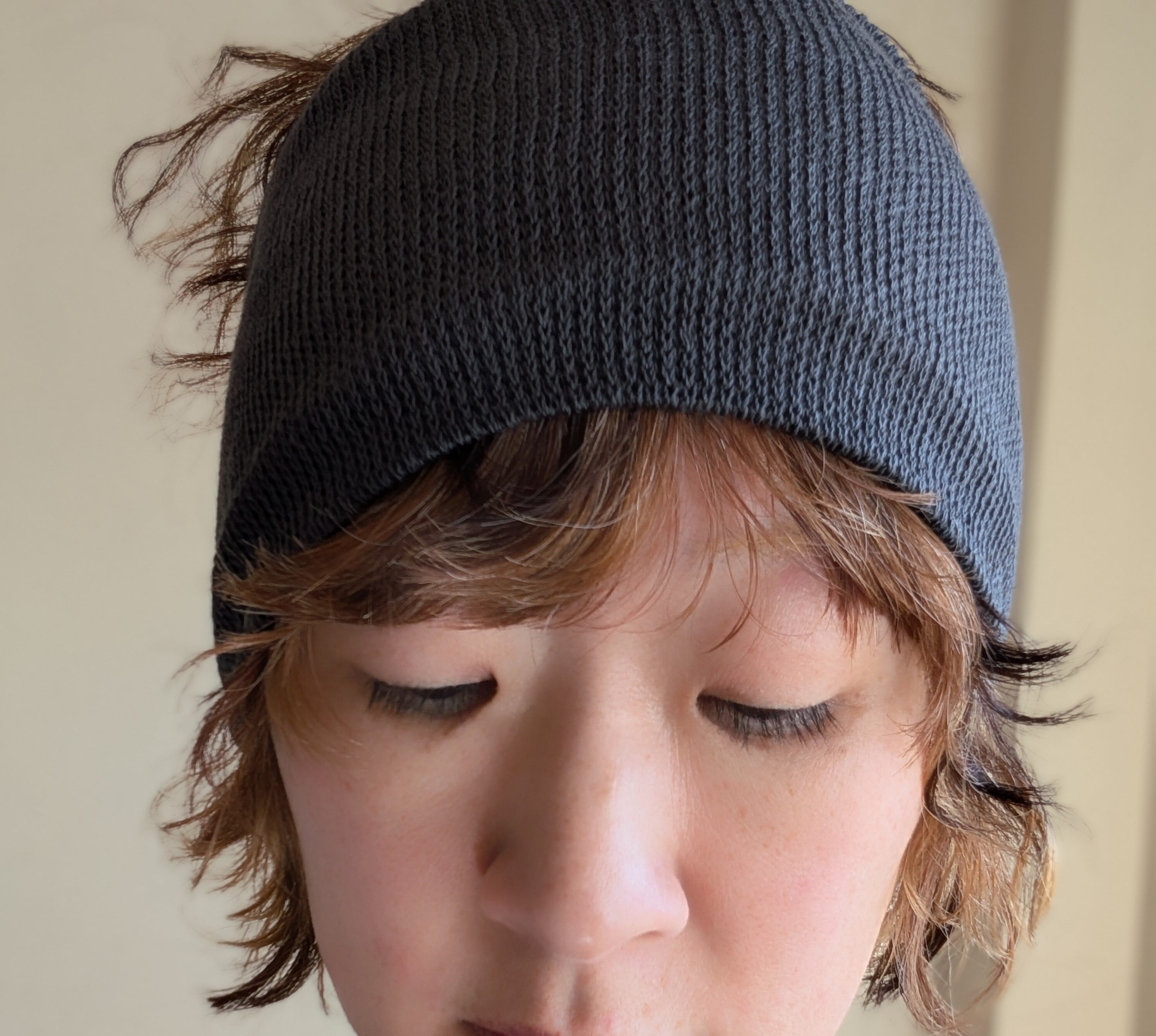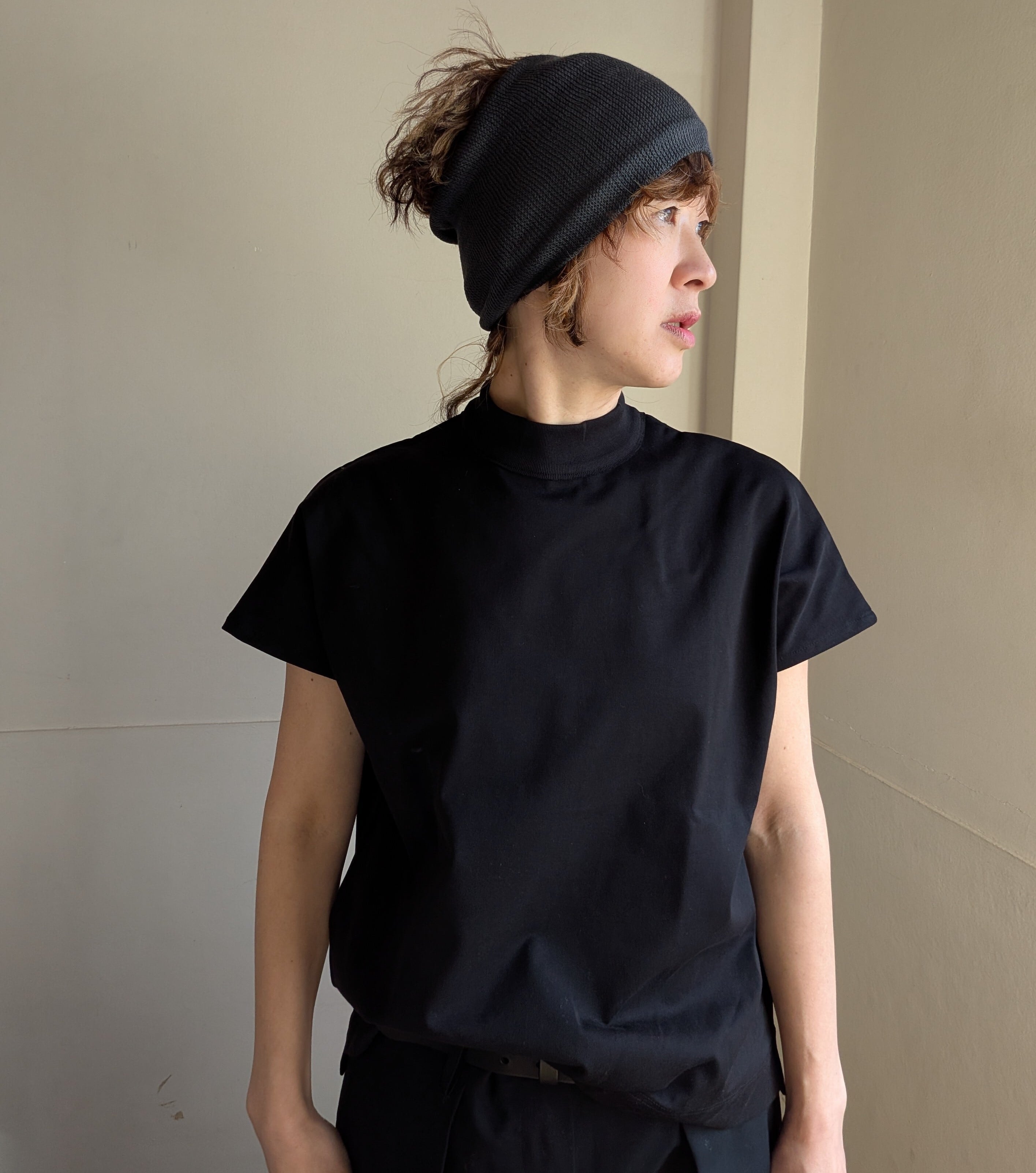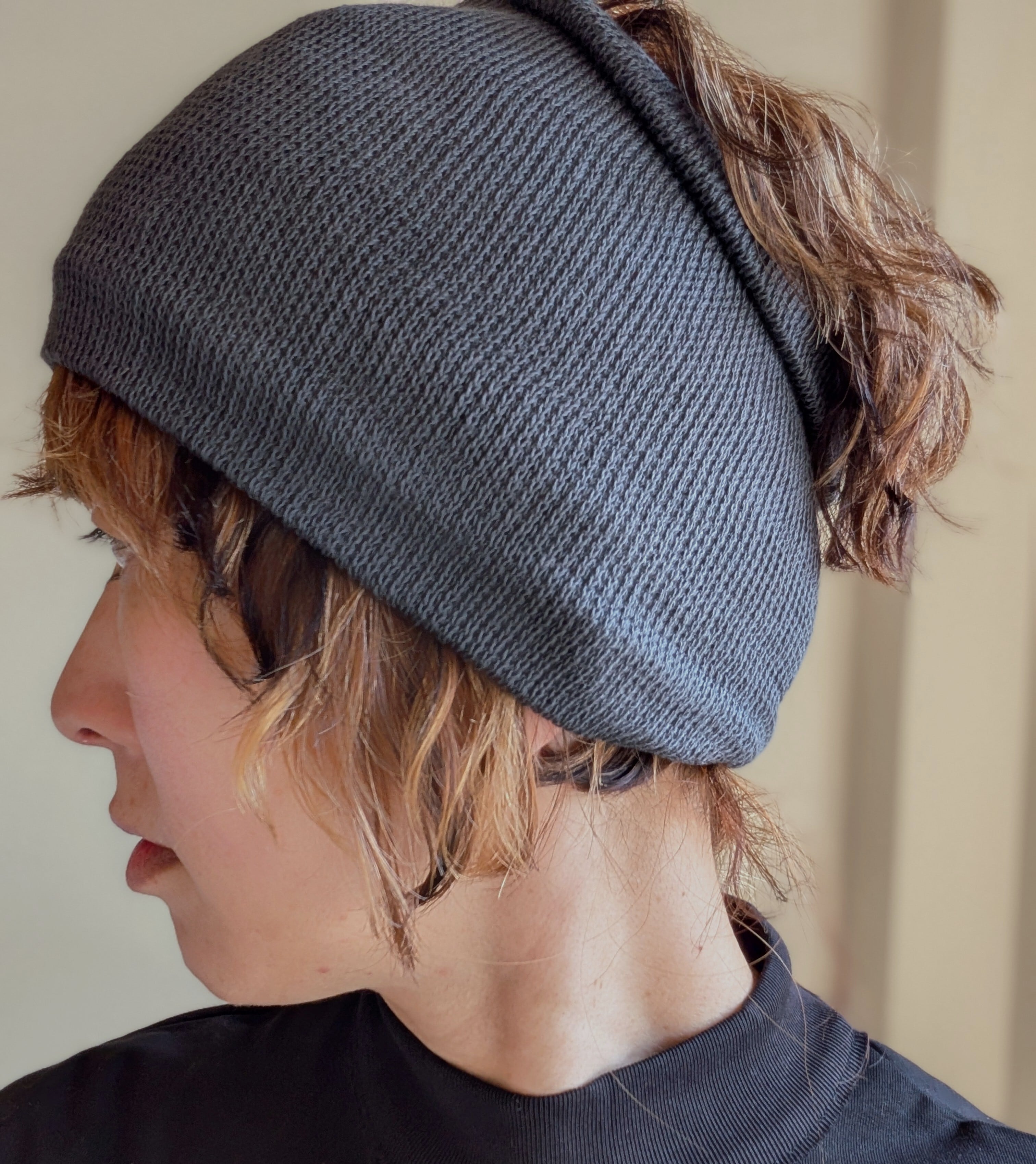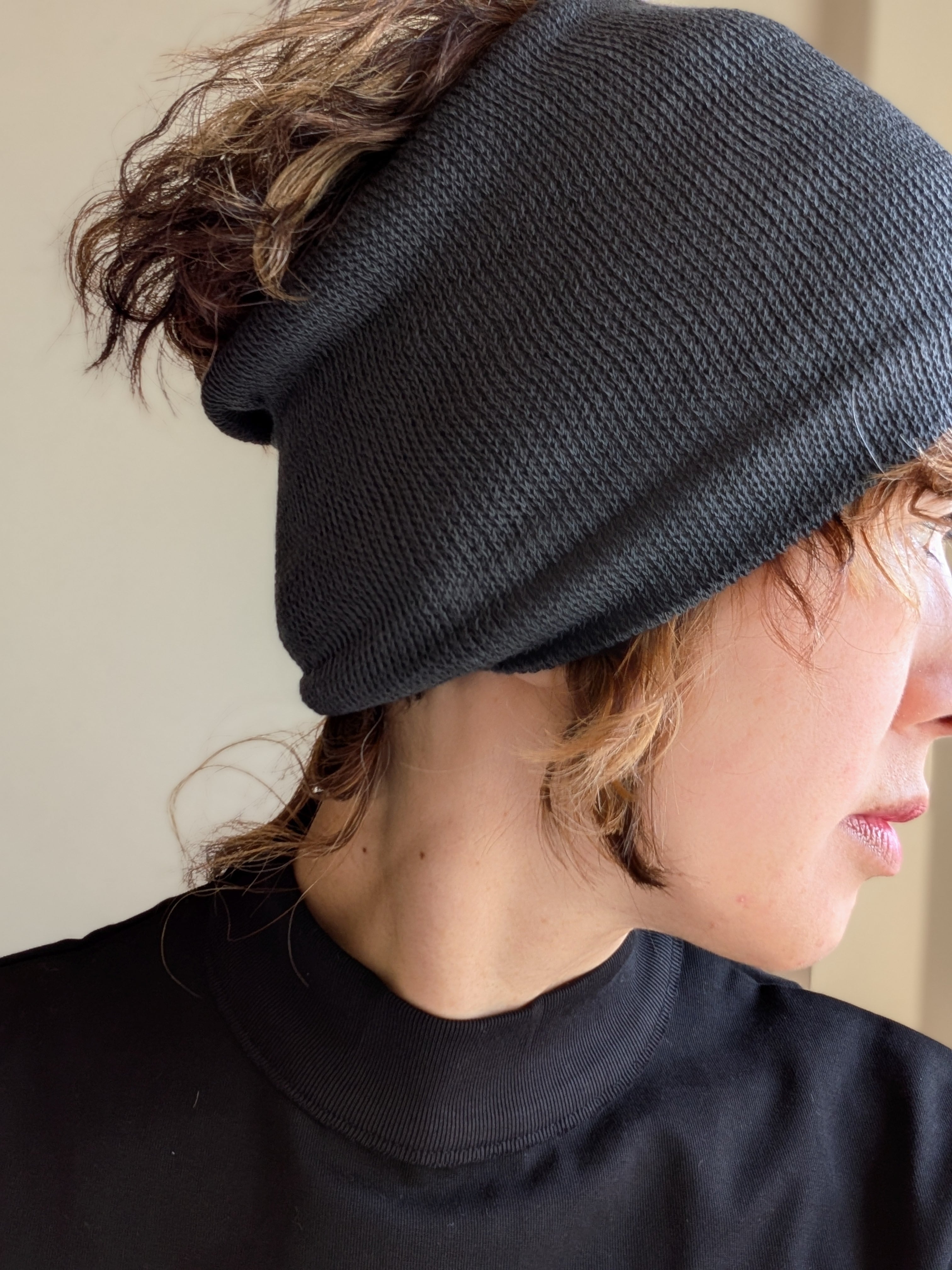 通常の靴下編機ですと幅は狭く頭に通らないのですが、特殊な釜の大きい(直径が大きく編める)